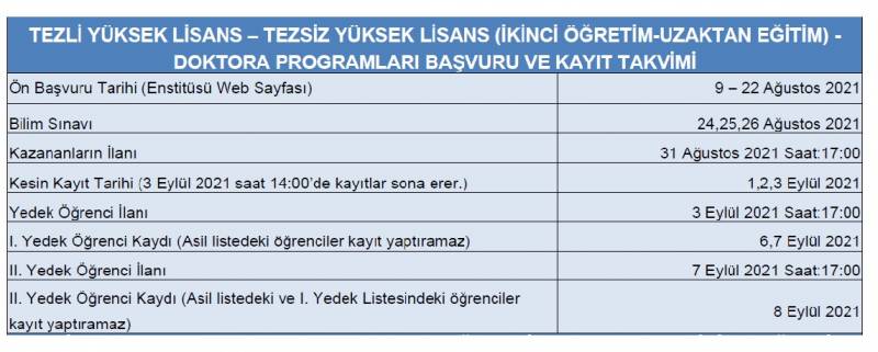 2021-2022 Güz yy. Lisansüstü Öğrenci Alım İlanı ve Başvuru Süreç Takvimi