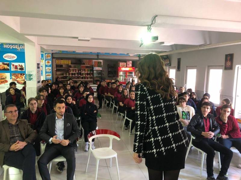 Bölümümüz öğretim elemanlarından Araştırma Görevlisi Burcu Koç, ilçemizdeki Atike Hanım Anadolu Lisesi'nde düzenlenen Kariyer Günleri etkinliği kapsamında lise öğrencileri ve İngilizce öğretmenleriyle buluştu. Yaptığı ilham verici sunum öğrenciler ve öğretmenler arasında olumlu yankılar uyandırdı. İnteraktif bir sunum gerçekleştiren Koç, öğrencilerin kariyer seçeneklerini daha iyi anlamalarına yardımcı oldu. Bu anlamlı ziyareti sırasında Koç, gençlerin ilham alarak geleceğe daha iyi hazırlanmalarına destek olmak için eğitim ve kariyerin önemine vurgu yaptı.