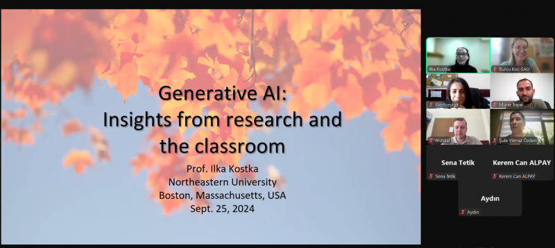 Yabancı Diller Eğitimi Bölümü öğretim elemanlarının ve Sakarya Üniversitesi eğitim komisyonunun yapay zekâ ile ilgili uygulamalarından sorumlu öğretim elemanlarının katılımıyla 25 Eylül 2024 tarihinde Zoom platformu üzerinden gerçekleştirilen çevrimiçi webinarda, Northeastern Üniversitesi'nden Dr. Ilka Kostka, "Generative AI in Education: Insights from Research and the Classroom" başlıklı sunumunu yaptı. Bölüm öğretim elemanlarından Arş. Gör. Dr. Burcu Koç’un girişimi ve davetiyle düzenlenen etkinlikte, yapay zekanın eğitimdeki kullanımı üzerine interaktif bir tartışma gerçekleştirildi. Webinar kapsamında iki kurumda yürütülen uygulamalar karşılaştırılarak Dr. Kostka ile Sakarya Üniversitesi öğretim elemanları arasında yapay zekâ uygulamaları hakkında fikir alışverişi yapıldı. İyi uygulama örneklerinin paylaşıldığı etkinlik, soru-cevap bölümü ve geleceğe yönelik ikili iş birliği fırsatlarının tartışılmasıyla sona erdi.